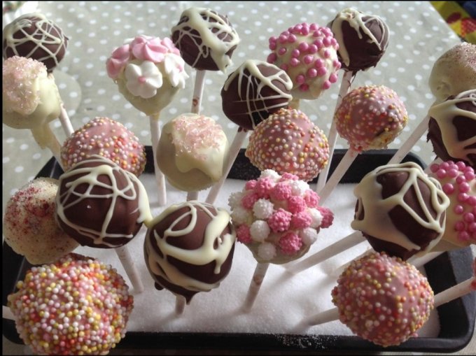 🔹Готовый бисквитный корж крошится на кусочки, которые далее смешиваются с глазурью или расплавленным шоколадом. Из полученной массы формуются шары, кубы или другие формы, по желанию. Полученный десерт крепится на деревянную или пластиковую палочку, подобно леденцу, охлаждается, и как только смесь затвердеет, приступают к украшению. Для оформления может быть использована специально приготовленная шоколадная глазурь, просто топлёный шоколад и различные кондитерские посыпки. Для цветных кейк попсов могут быть использованы пищевые красители.