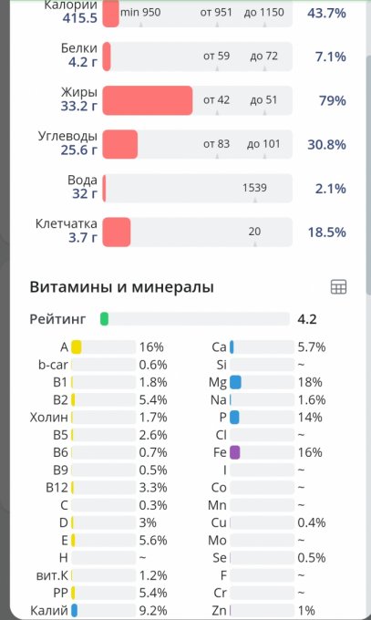 Рацион пока примерный - реальное количество некоторых продуктов изменится и эти изменения внесу вечером. Небольшой перебор по УВ получился из-за того, что в холодильнике уже несколько дней лежат виноград и хурма, которые не влезали никак в рационы, а сегодня решила их съесть всё таки. Плюс чиабатта, которая мне очень нравится с молоком и хотя бы кусочек в день съедаю. Но больше всего, конечно, отразился на УВ виноград. Убавлять не стала - 100 г и так немного. Но в целом всё зелененькое и рейтинг 100%.