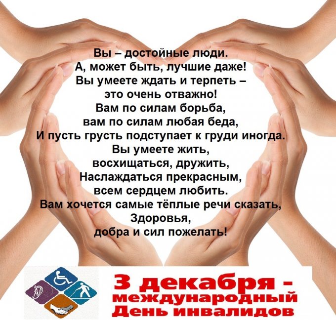 5. В 1992 году в конце Десятилетия инвалидов Организации Объединенных Наций (1983—1992) Генеральная Ассамблея ООН своей резолюцией провозгласила 3 декабря Международным днем инвалидов, с целью продвижение прав инвалидов во всех сферах общественной жизни, а также привлечение внимания к проблемам инвалидов. В декабре 2006 года Генассамблея ООН приняла Конвенцию о правах инвалидов. В мире более 1 миллиарда человек имеют ту или иную форму инвалидности (что соответствует примерно 15% населения мира), более 100 миллионов инвалидов — дети.