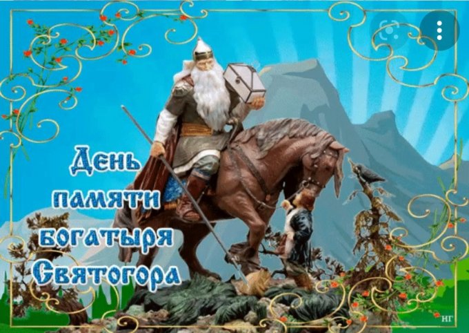 2. Теперь о славянском интересном празднике - Дне памяти богатыря Святогора . Кроме Ильи Муромца, Добрыни Никитича, Алеши Попович известен еще один богатырь-защитник земли Русской — человек-великан Святогор. "Если Святогор пускается в дорогу, то мать-сыра земля сотрясается — леса колышутся и реки выливаются из берегов". Его вещи и оружие имеют огромные размеры — они в полтора-два раза больше, чем вещи обычных людей. Перед смертью согласно былине Святогор с дыханием передаёт Илье Муромцу часть своей силы.