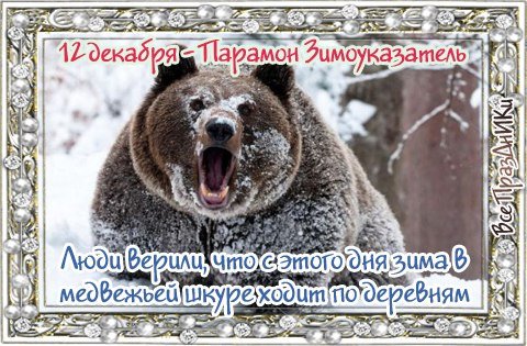 __Также на Парамона говорили, что «земля каменеет, а речка стынет». Люди верили, что с этого дня зима в медвежьей шкуре ходит по деревням, по крышам стучит, бабам велит вставать, печи топить, каши варить.
