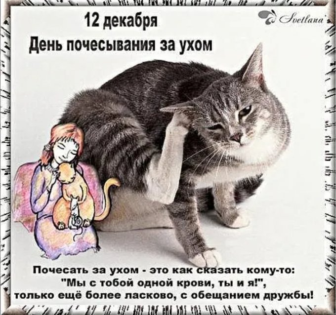 💠7. День почесывания за ухом – отличный денечек. Надо только определиться, кому будем чесать – себе или кому-то еще. Ну, с собой-то все понятно, берем собственную ногу и пробуем дотянуться до уха. Даже если не получится, то заряд смехотерапии Вы точно получите.