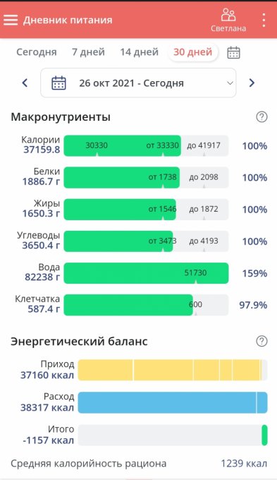 __Результат - при средней калорийности за месяц 1239 ккал (для меня это довольно много, снижения веса при такой калорийности у меня нет) вес колебался примерно на одном уровне, полоски в среднем за месяц всё зелёные (только нжк в жирных кислотах небольшой перебор) и рейтинг средний за месяц 99% (это меня особо радует).