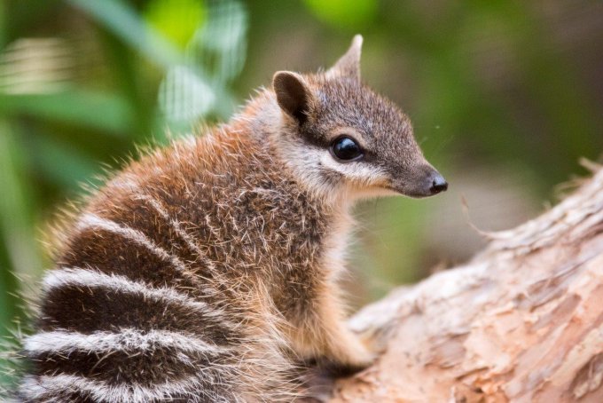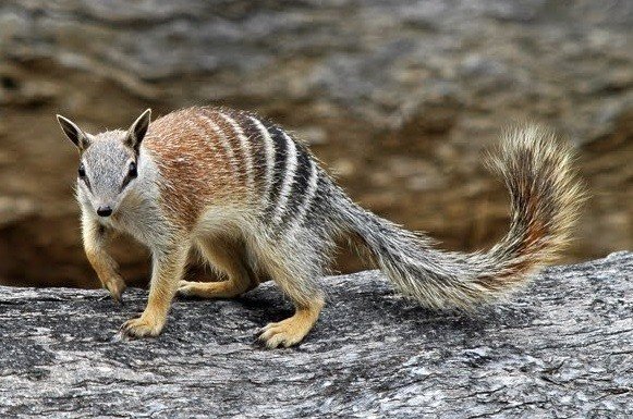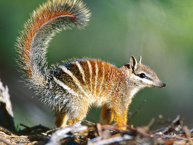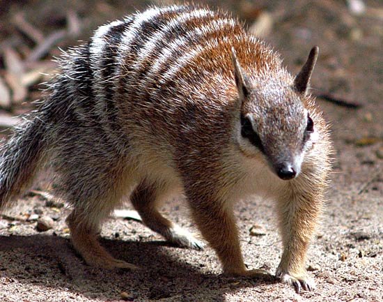 __Длина тела около 27 сантиметров, хвоста 13-17 сантиметров, вес 200-500 г (самцы крупнее самок). Шерсть имеет яркий серо-коричневый или рыжеватый цвет с продольными кремовыми полосами на спине. На спине 6–12 белых полос, которые чередуются с черной шерстью. На мордочке, от основания уха через глаз к кончику носа, черная полоса. Шерсть на хвосте густая, в случае опасности и при передвижении по стволу дерева он распушается и напоминает хвост белки. Намбата считают одним из самых красивых животных, населяющих австралийский континент.