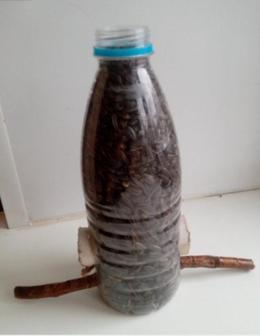 __Орнитологи утверждают, что из 10 синиц 9 не доживут до весны не столько от холода, сколько от недостатка пищи.Вот здесь есть изготовление автокормушки только для синичек из пластиковой бутылки. Проверено - едят только синички. Я делала такую, только вместо картонки внутри брала пластиковую бутылку меньшего диаметра, обрезая её с обоих концов. А когда кормушки общие, то воробьи не дают синичкам поесть - сами всё съедают...