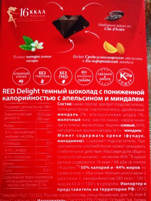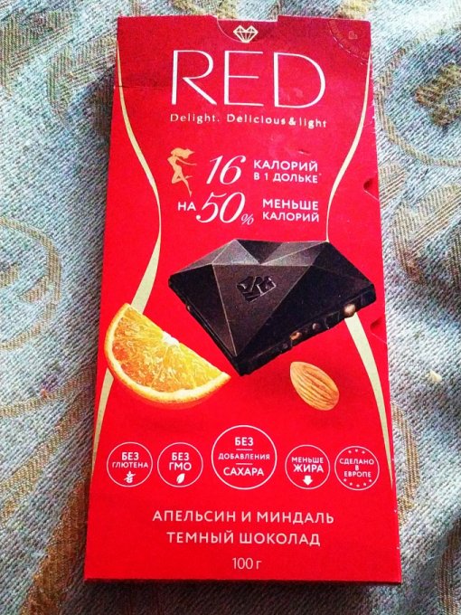 | Шоколад RED темный с апельсином и миндалем, на 50%меньше калорий |
