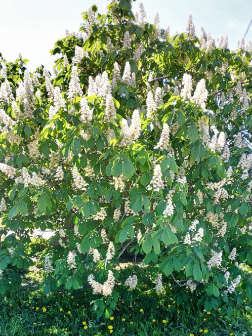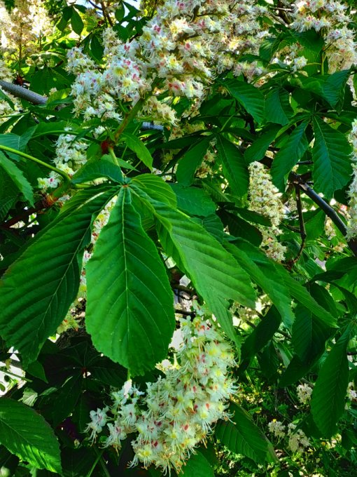 ___Увидела в городе дерево, которого никогда раньше вроде не видела, по крайней мере цветущим. Может, какой-то орех из более теплых краев? Листья необычные - семилопастные, цветет красиво - кисти намного крупнее, чем у сирени... Кто знает, что это?
