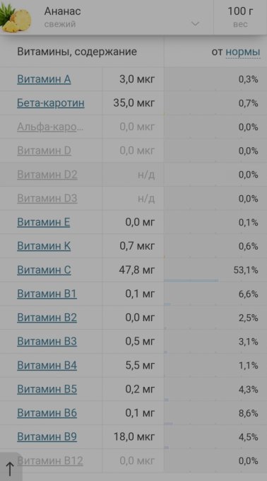 мг % аскорбиновой кислоты. Кроме этого в ананасе присутствуют