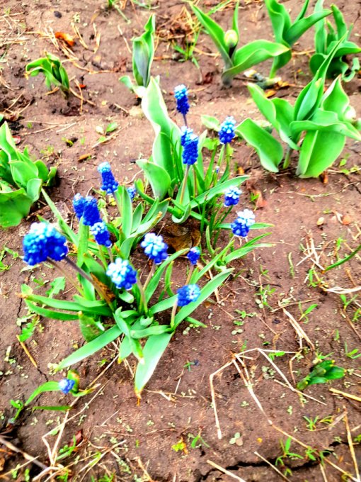 головки мускари и гиацинтов. Тюльпаны уже высокие выросли🌷, но пока