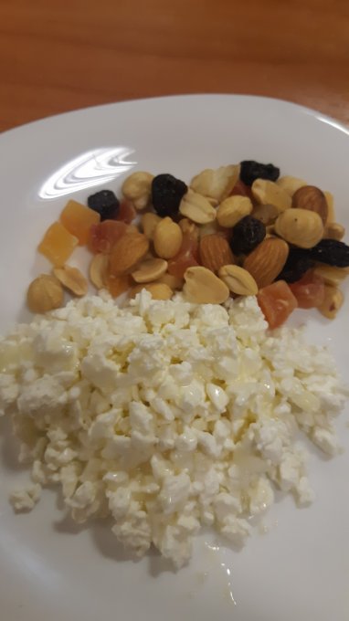 Утром доела то, что вчера оставила, оказалось чуть меньше половины творога, но тут написала половину, чтоб не поправлять вчерашний дневник. Орехов не знаю сколько грамм, написала приблизительно.