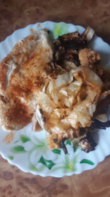 На ужин запекала капусту в духовке. И жарила куриную грудку на сухой сковородке. Кстати такая курица сыну нравится, готов есть ее постоянно.
