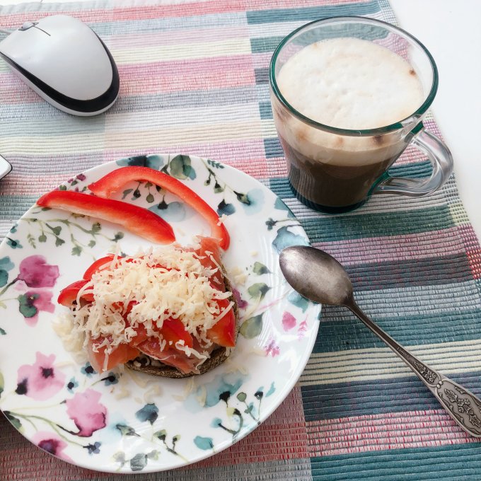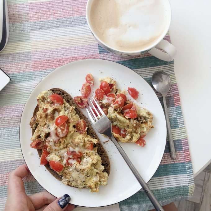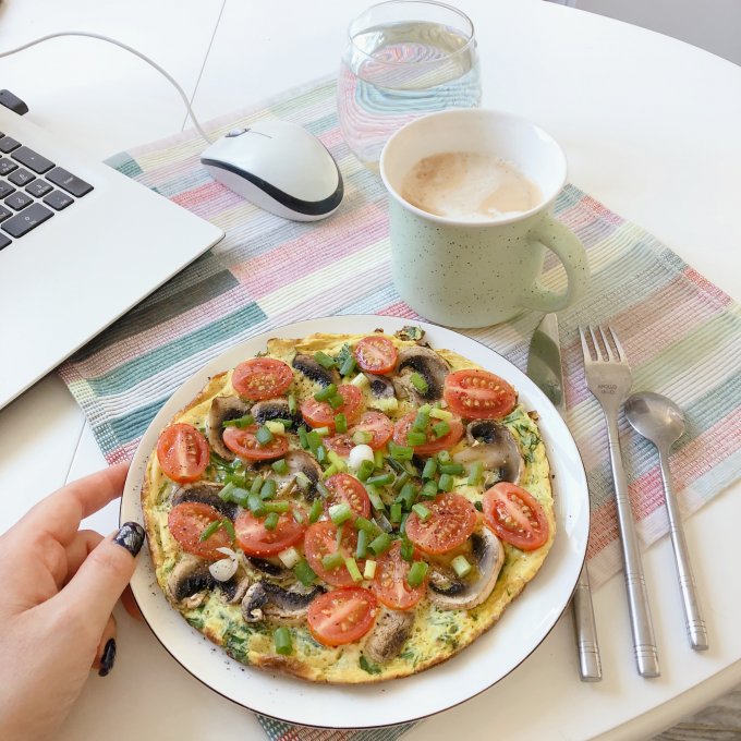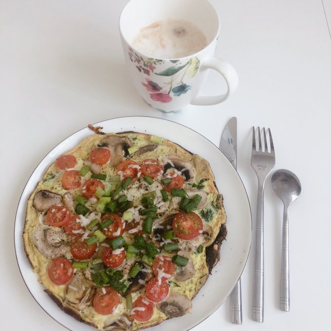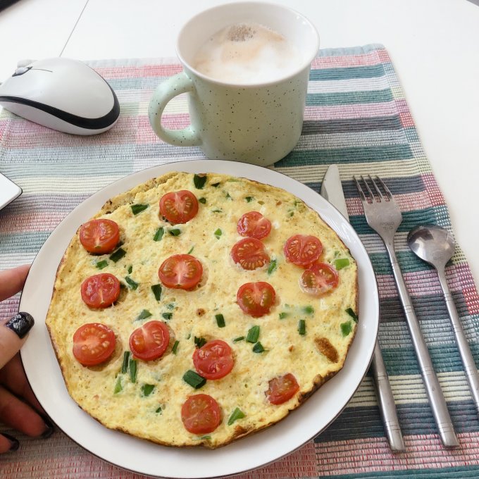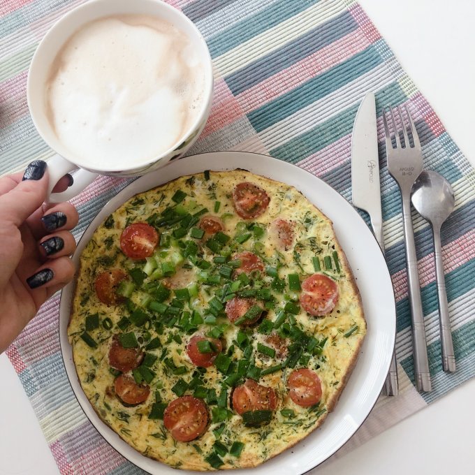Завтрак: омлет из двух яиц с сыром сулугуни, укропом и зелёным луком и с томатами. Грибочки закончились, забыла вчера об этом. И капучино ❤️