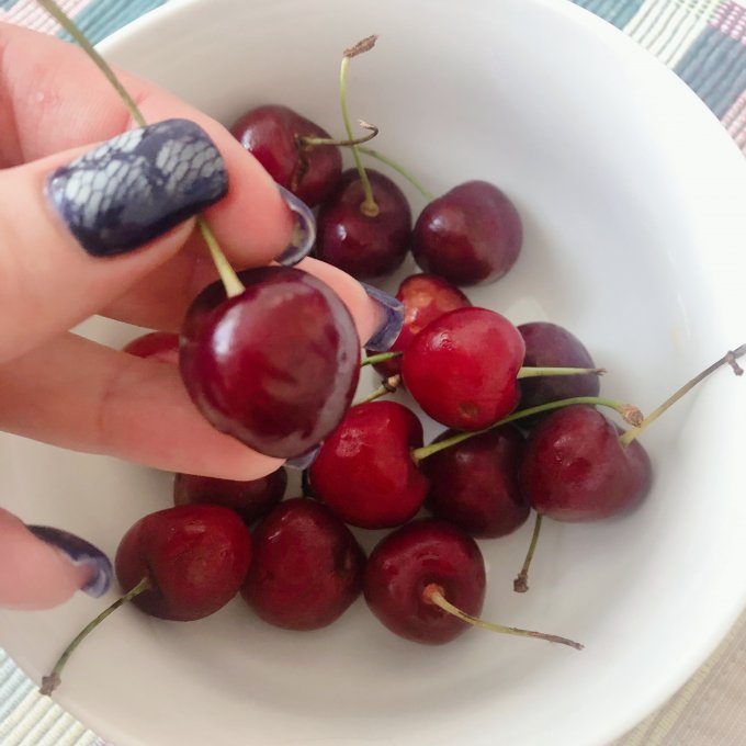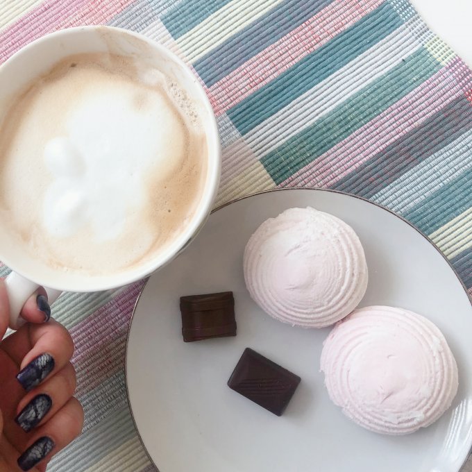 И мои вкусняшки: зефир, две конфетки, кофе и черешня. 🍒 🍬 ☕️
