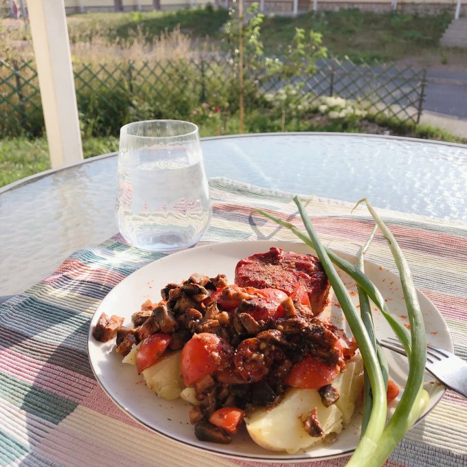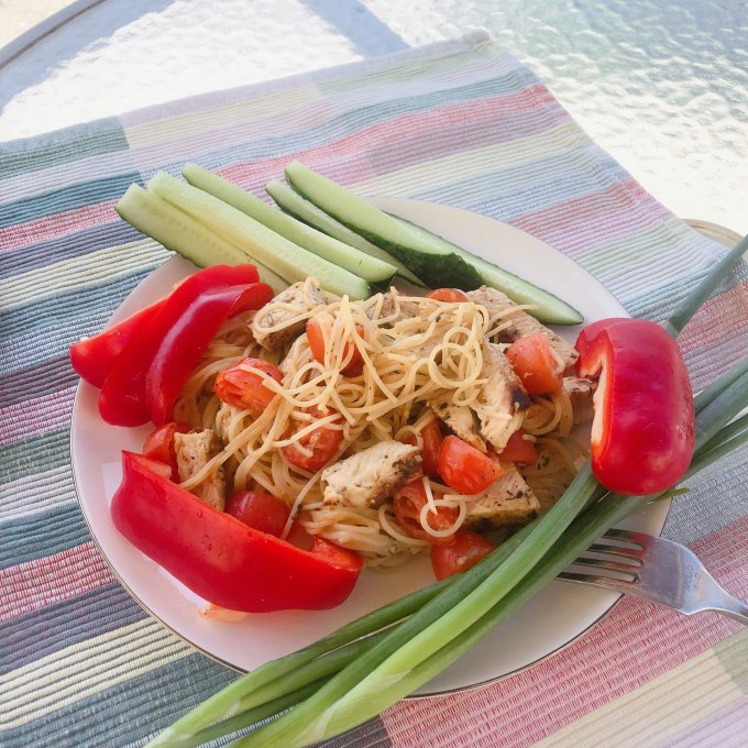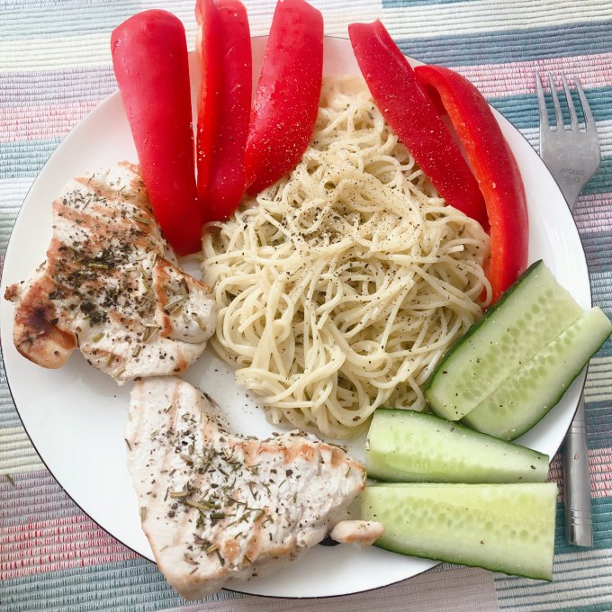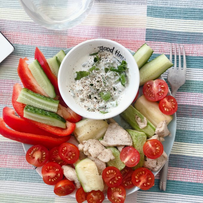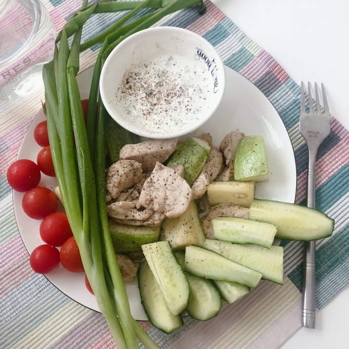 Обед: куриная грудка и кабачок, обжаренные в оливковом масле с чесноком и перцем со свежими овощами и соусом из зелёного лука, перца и сметаны.