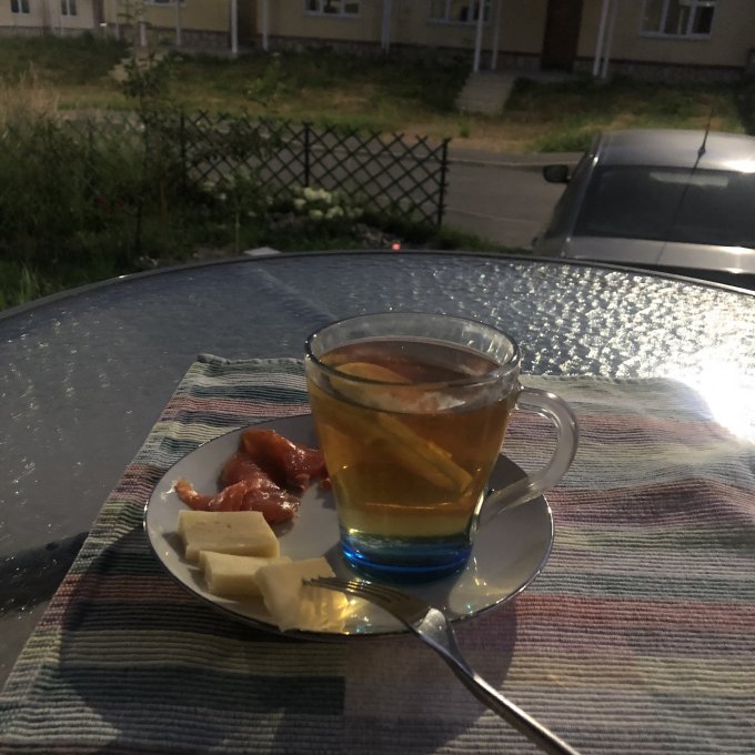 И вечерний перекус - сыр, солёная рыба и чай с лимоном.