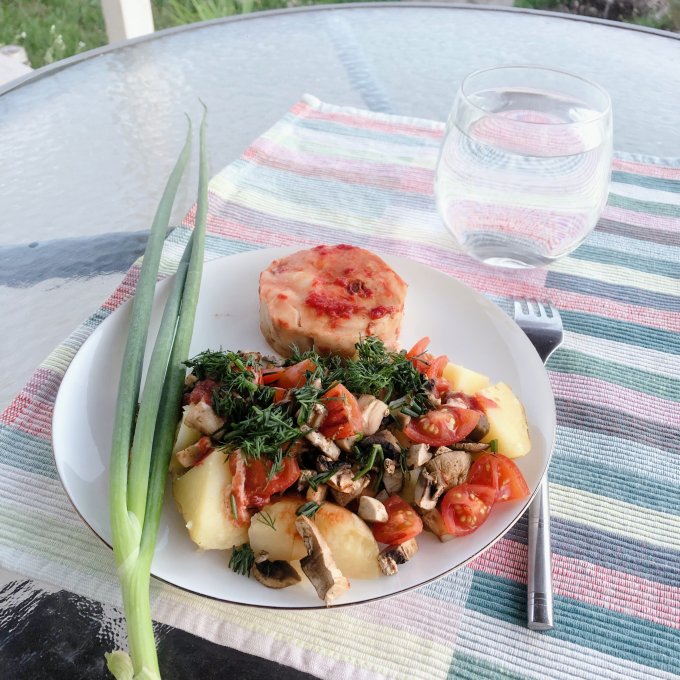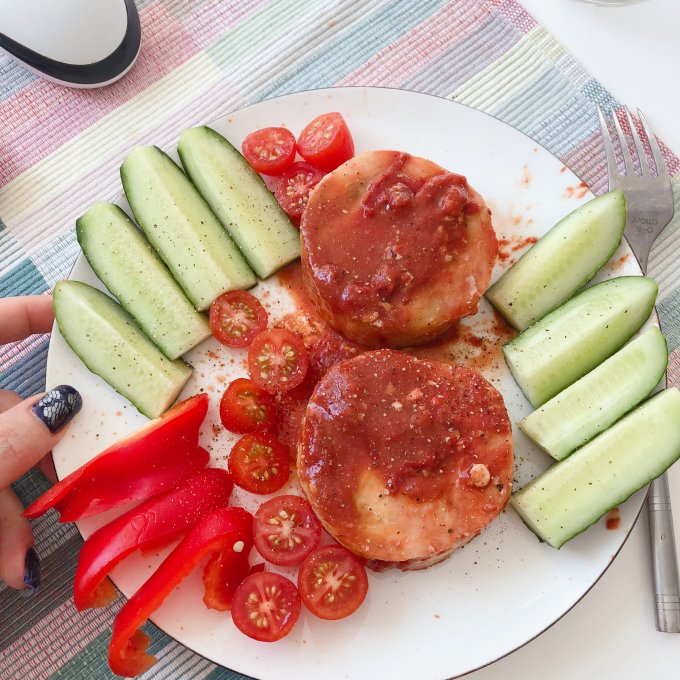 На ужин в 17:00 хек со свежими овощами. Картошка не влезла из-за арбуза. Расстроилась, хотела её.