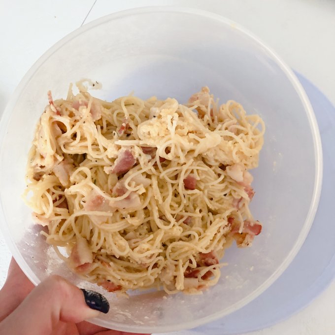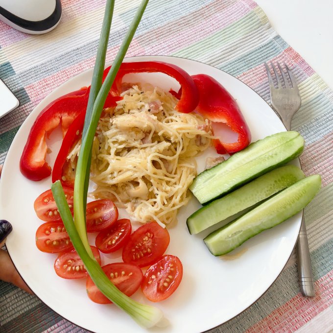 Обед: карбонара - не собиралась есть, но это моя любовь, взяла 100гр. и свежие овощи.