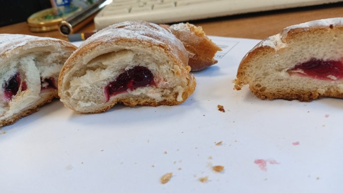 Утром купила булочку, но она оказалась не мягкая, поэтому съела, но не сразу тк в ней был вишнёвый джем. Аж самой странно