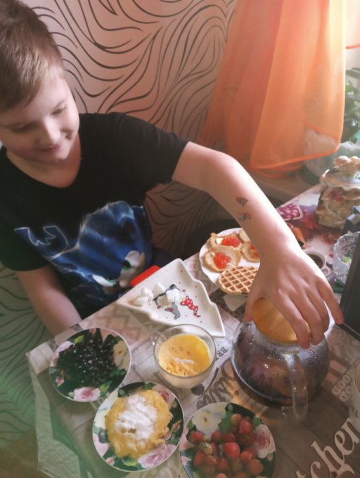 Вчера с внуком нарядили елку . Гирлянду не нашли, как можно было убрать удивляюсь себе, повесили только гирлянду на окно, Сегодня международный день Чая! Утром сказала внуку, что праздник чая,стали заваривать,блинчиками заедать, а он после завтрака с чаем, ожидал, когда будем праздновать, спрашиваю, а как надо праздновать:Хлопушки и шары !:сказал внук