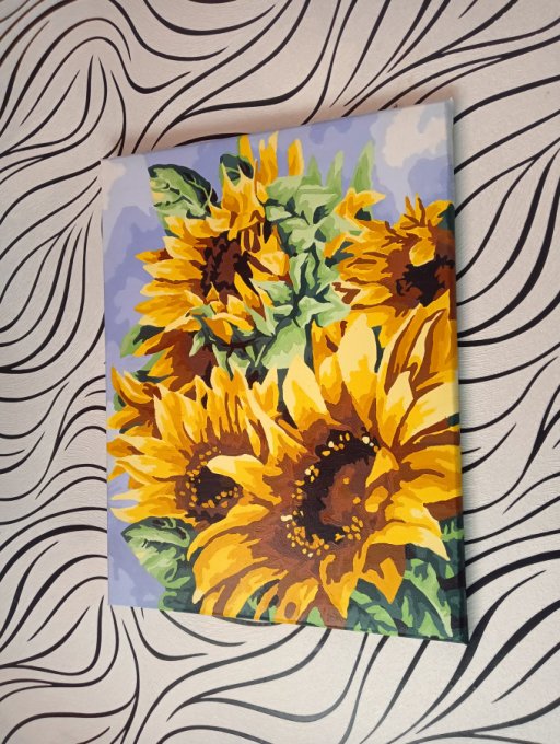 Картину по цифрам с подсолнухами дорисовала внучка, повесили на кухню