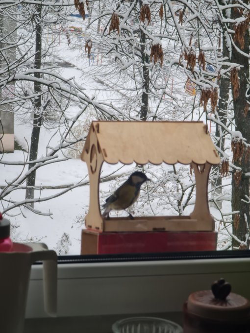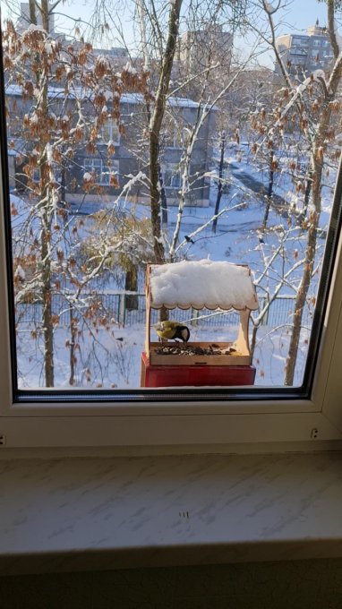 Выходной. На рынок съездить не получилось - сестра попросила помочь с кое-какими косметическими процедурами. Зашла в пару магазинов, стирка, глажка предыдущей постирушки, закрепила за окном кормушку - на фото первый посетитель)))