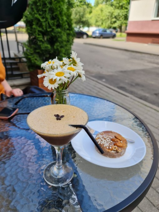 Планы изменились, к сожалению, случайно встретилась с подругой, заглянули в кофейню, отметили встречу))). Коктейля *Эспрессо мартини* нет в базе, записала подходящим по калорийности. Кофе *Халвичный джаз*  - то же, все примерно). Долго гуляли.