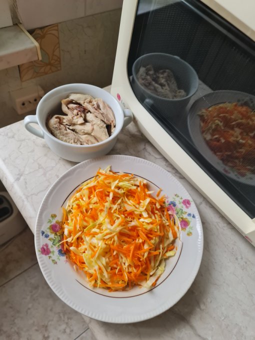 Прогулка 7100 шагов, 4.6 км, 251 км. Жор... Во всяком случае, все записываю...И, кстати, такой аппетит развивается всегда на фоне приема хороших витаминов.. Вчера приготовила котлеты с капустой - капусту пробила в комбайне до крошки - это ошибка, капусту только резать!
