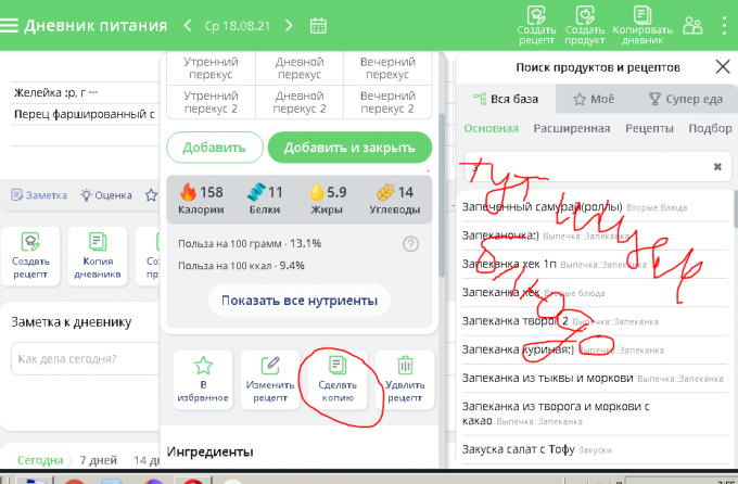 дневника находим блюдо и нажимаем, чтоб добавить в дневник и там