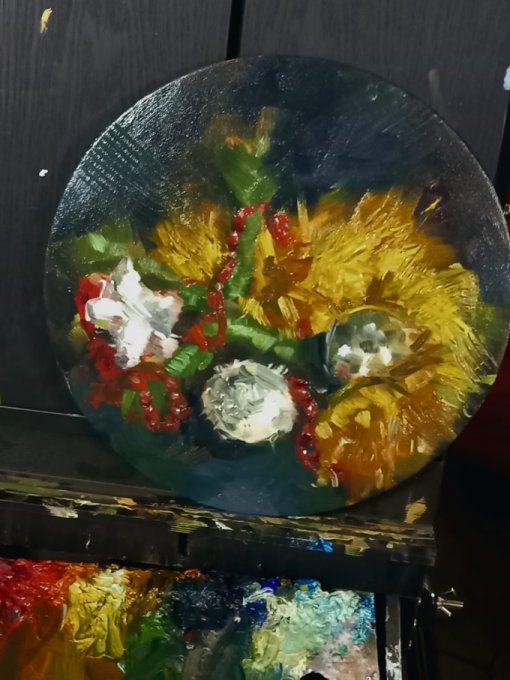 Быстрый новогодний этюд маслом на круглом грунтованном картоне. Ребенок сказал что ничего прорисовывать не будет)) это же ЭТЮД...Писала 2 часа