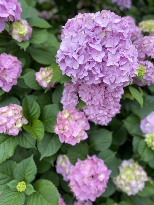 подозрением обнюхивает гортензии, которых у нас в саду в изобилии.