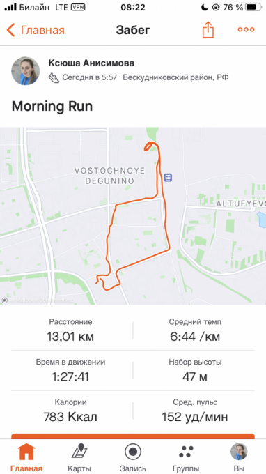 Сегодня была пробежка. Разминка, фартлек по пульсу и заминка. Итого 13 км. Бодренькое утро)