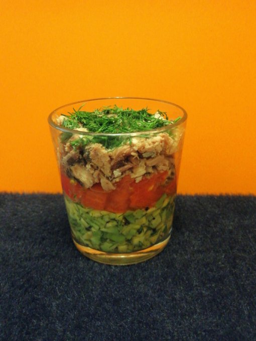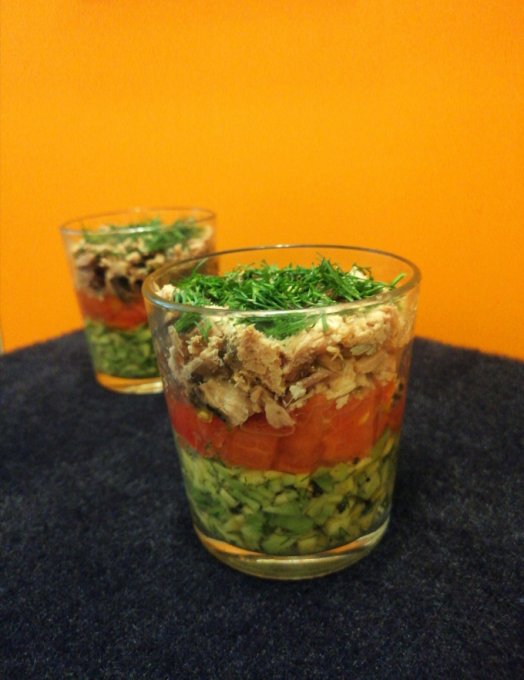 Далее всё сложить слоями авокадо, помидор, тунец, зелень.