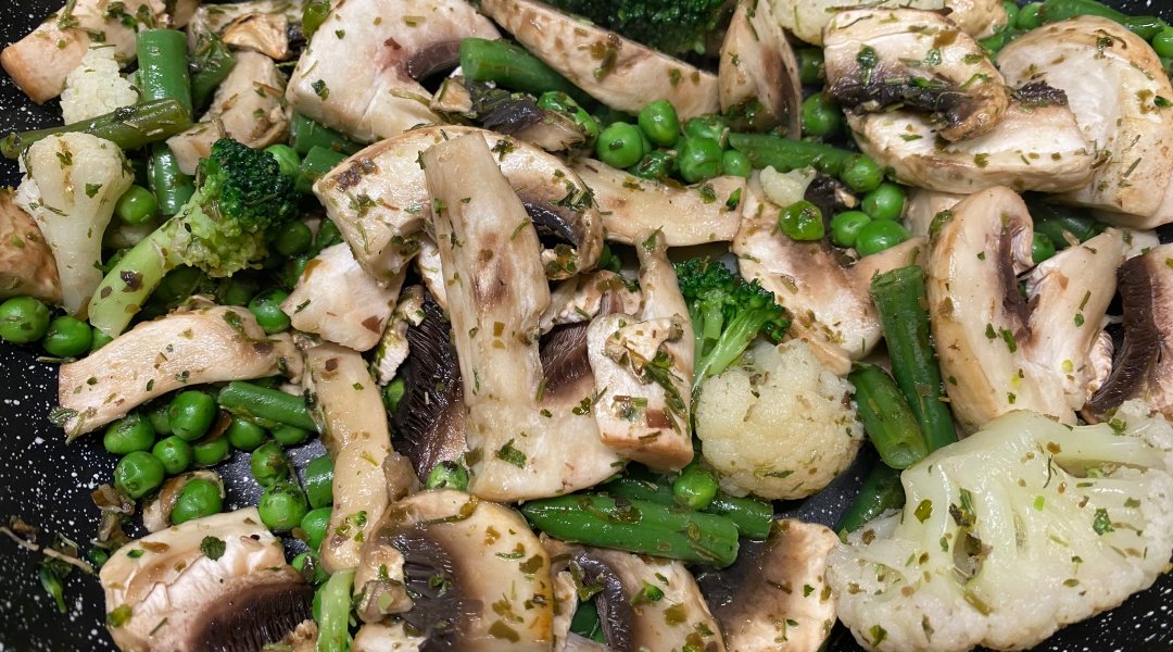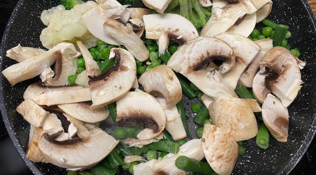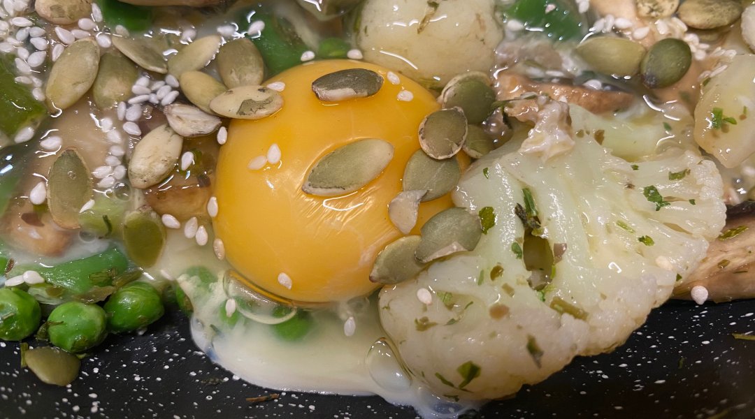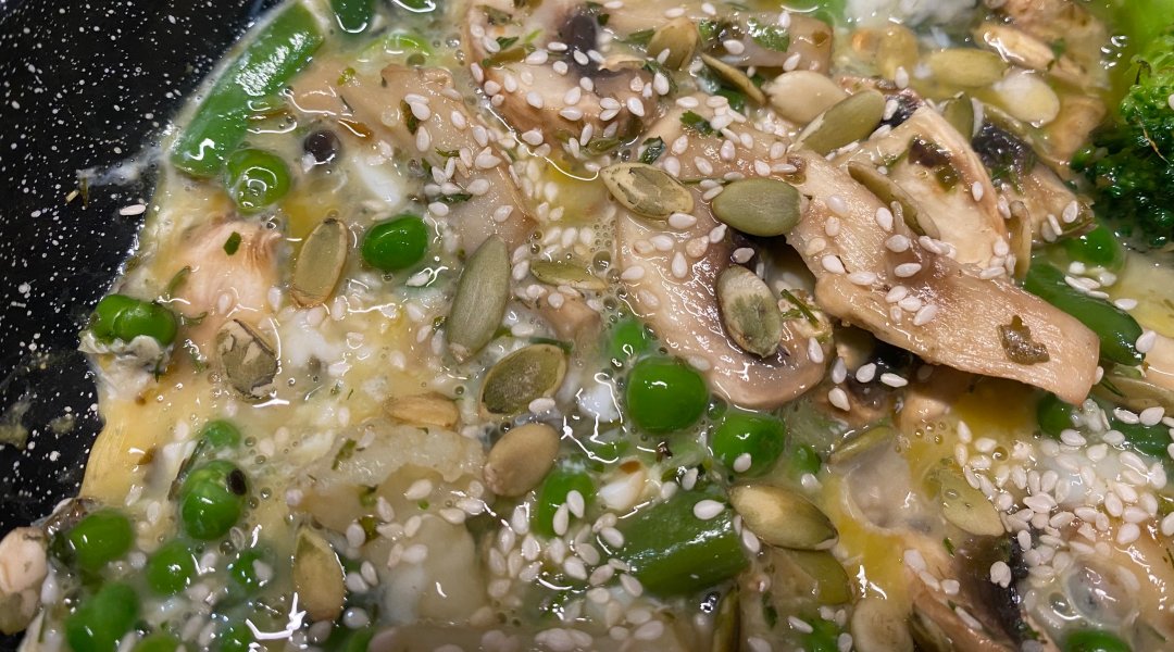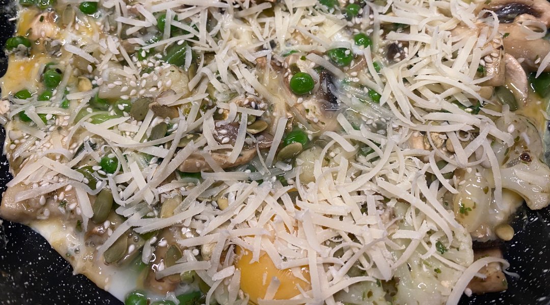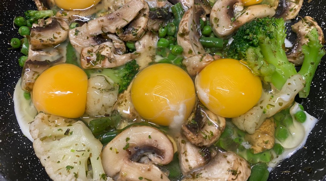 | Яичница с брокколи, стручковой фасолью, зеленым горошком и шампиньонами |