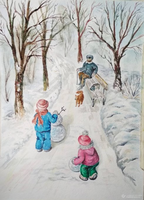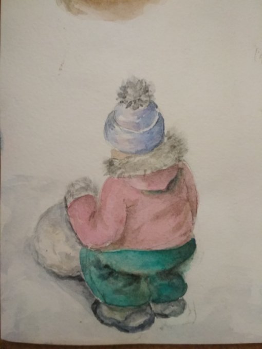 просто сидит около снежка, а на рисунке он в движении катит его, и