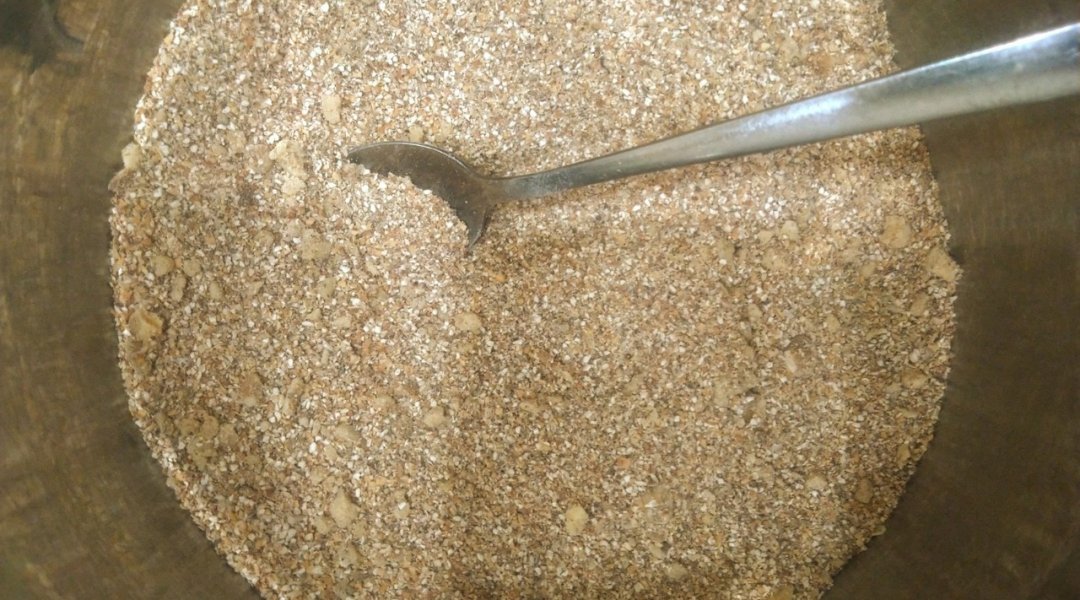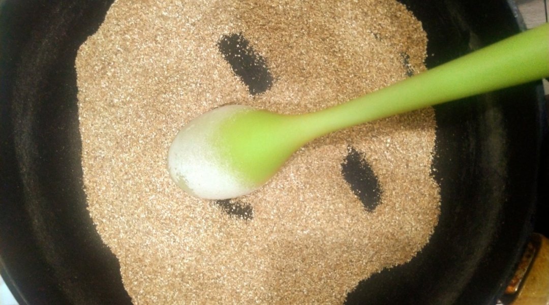 Овсяные отруби поджарить на сухой сковородке, постоянно помешивая до золотистого цвета.