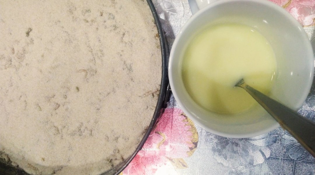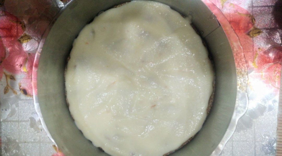 Не остужая крем, отложить около 100 грамм в отдельную посуду и всыпать в него несколько ложек отрубей, вымешать, пока смесь не станет настолько густой, чтобы можно было сформировать из неё основу для торта. Взять разъёмную форму или поставить кулинарное кольцо на блюдо и сделать основу на дне.