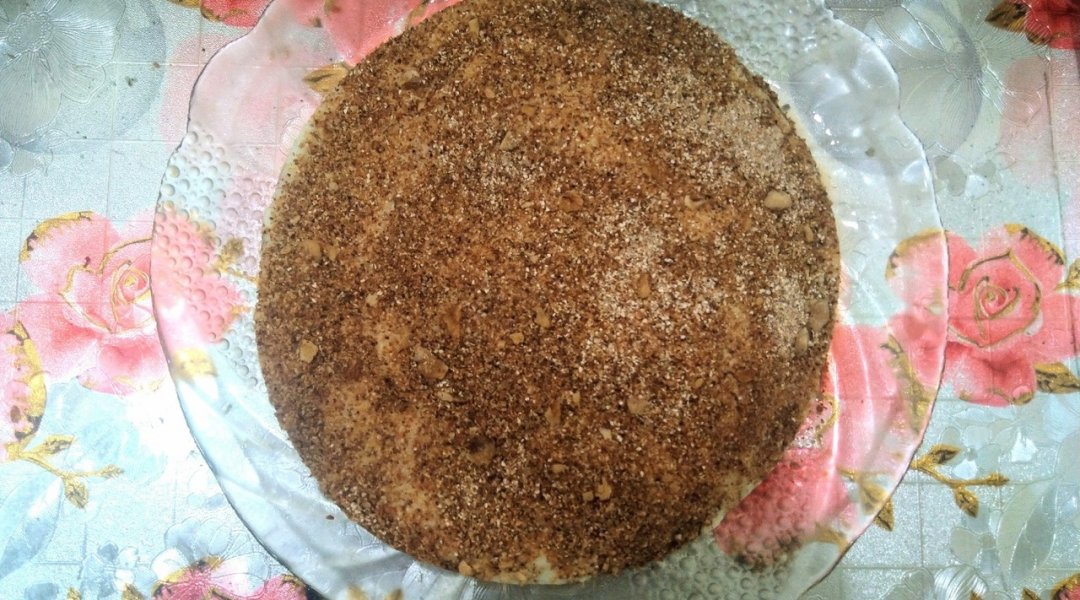 Далее слоями выкладывать крем и отруби. У меня вышло 3 слоя крема, пересыпанные в промежутках отрубями с орехами. Последним слоем должны быть отруби.