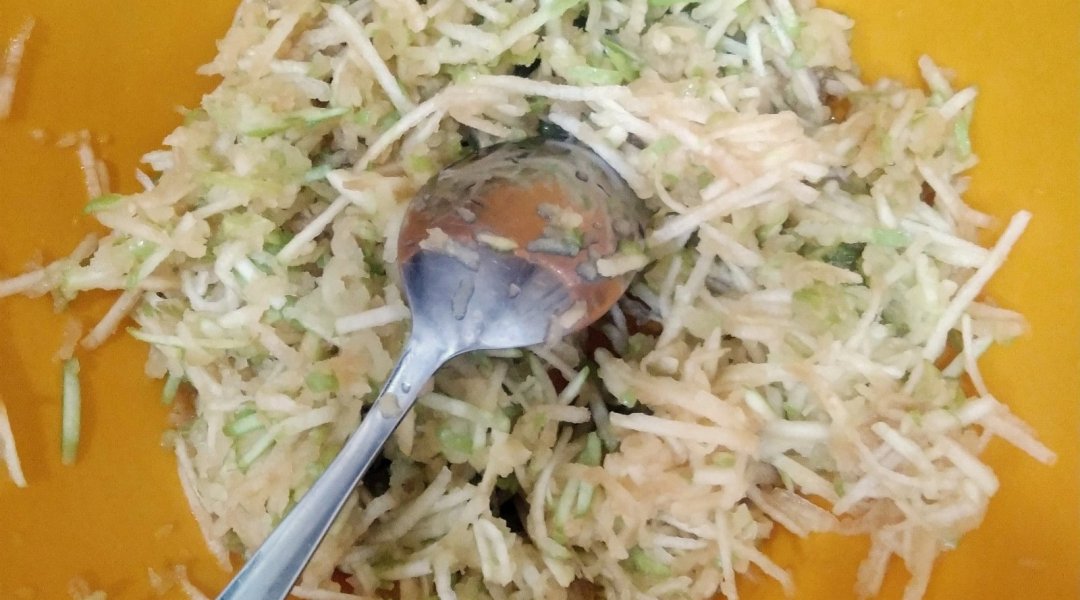 Яблоки натереть на тёрке и полить лимонным соком. Я использую тёрку для моркови по-корейски.