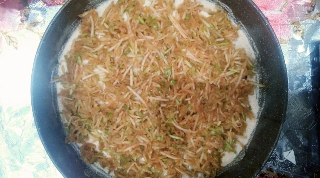 Разьемную форму смазать маслом и слоями выложить сыпучую смесь и яблоки. Сухую смесь разделить на 4 части, получается по 120 гр, а яблоки на 3 части. На дно первой идёт манка с мукой, дальше яблоки. Яблоки следует разравнивают ложкой.