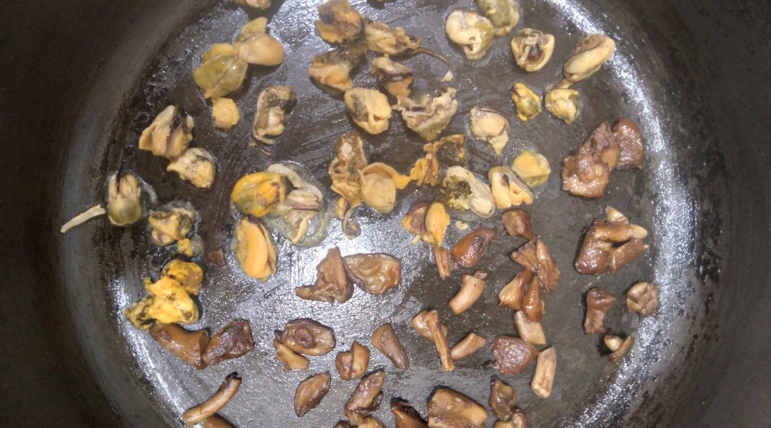 Грибы и размороженные подсоленные мидии разложить на хорошо разогретой сковороде, смазанной маслом