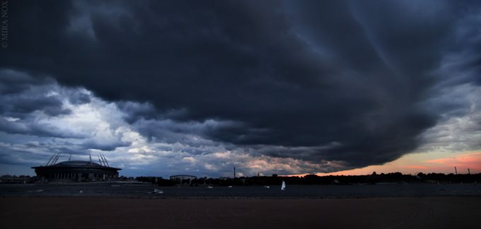 Мне просто нереально повезло как фотографу сделать такие кадры:ah: Ехала снимать закат, а застала нереальную картину, над стадионом Газпром Арена сгущались тучи, небо менялось каждую минуту, было ощущение, что я нахожусь на другой планете и стадион - это космический корабль😀 В итоге я, конечно же, попала под жуткий ливень, но оно того стоило:хорошо: