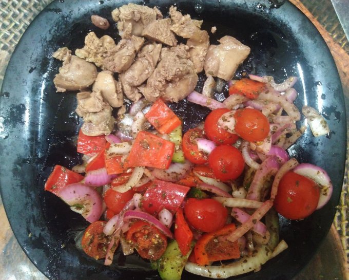 Привет всем) Что-то я подсела на куриную печень, причём она очень вкусная даже просто отварная, без лишних заморочек.:хорошо: А на гарнир салатик с орегано и базиликом, заправленный лимонным соком. Я так раньше Греческий делала, только с фетой. А сейчас, получается, фету куриная печень заменяет.:ah: