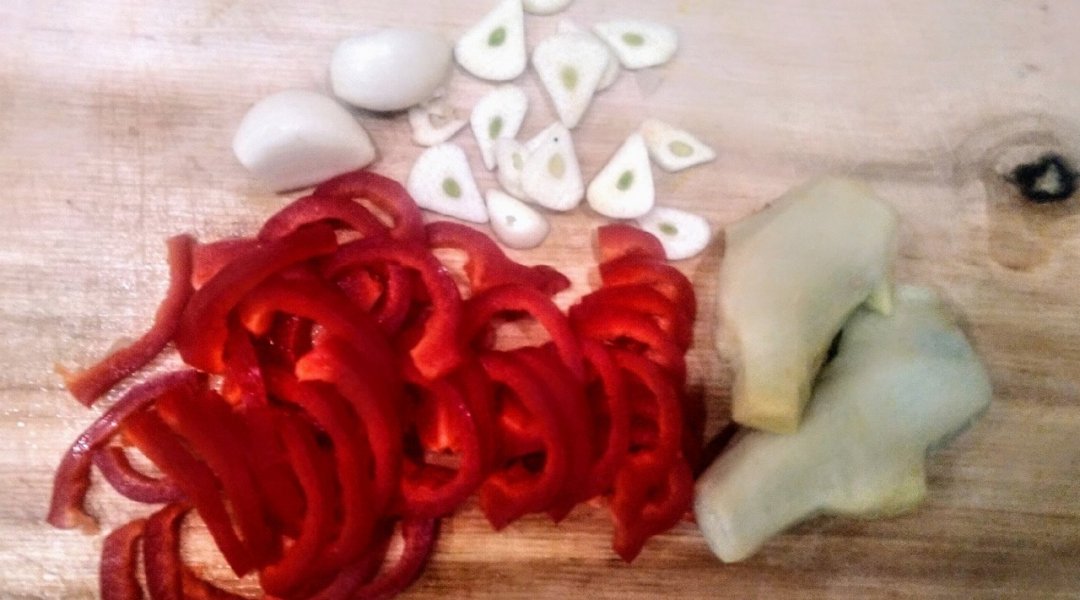 Почистить и нарезать чеснок, перец чили кольцами или полукольцами,