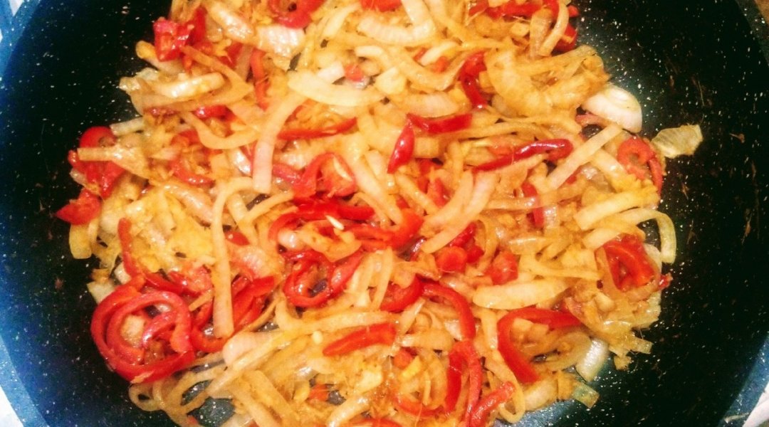следом лук, через минуту перец чили. В процессе обжарки добавить