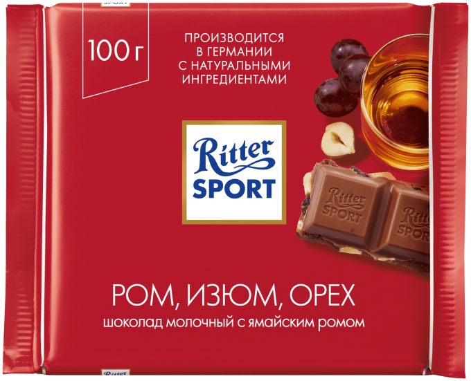 | Шоколад Молочный с Ямайским Ромом, Изюмом и Орехом Лещины [Ritter Sport] |