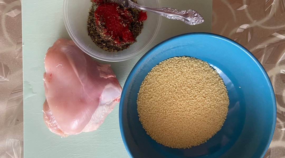 Куриное бедро без кожи натереть томатной пастой и прованскими травами