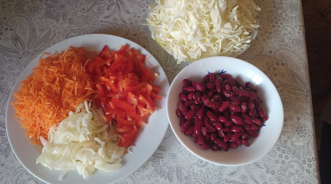 тёрке, перец тонкой соломкой; фасоль консервированную