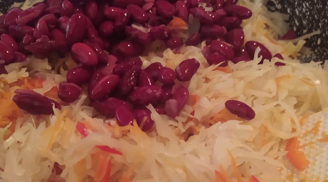 Далее добавляеи капусту и фасоль, соус, специи, всё перемешиваем и