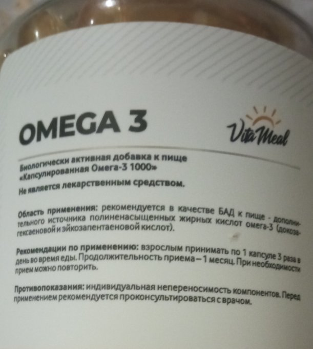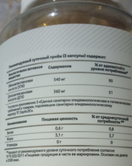 3 капсулы: ПНЖК Омега-3 150 мг., в том числе Эйкозапентаеновая кислота (EPA)30 мг, Докозагексаеновая кислота (DHA) 37,5 мг. 6 капсул: ПНЖК Омега-3 300 мг., в том числе Эйкозапентаеновая кислота (EPA)60 мг, Докозагексаеновая кислота (DHA) 75 мг. 9 капсул: ПНЖК Омега-3 450 мг., в том числе Эйкозапентаеновая кислота (EPA) 90 мг, Докозагексаеновая кислота (DHA) 112,5 мг.