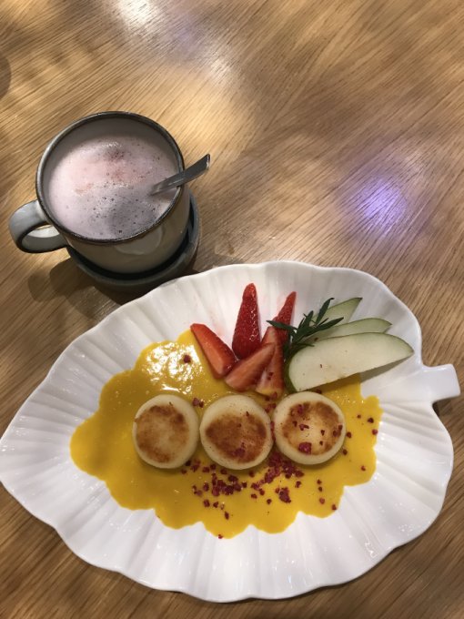 Показали мне целую папку. Выбрала сырники в манговом соусе. Принесли три малюсеньких сырника, максимум на120 грамм все, остальное -соус и украшения. В карте указан вес 250 грамм и общая калорийность блюда -почти 456 калорий.